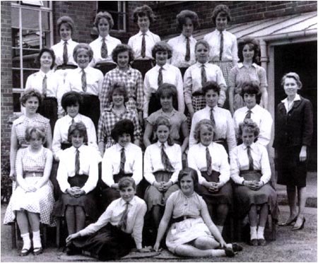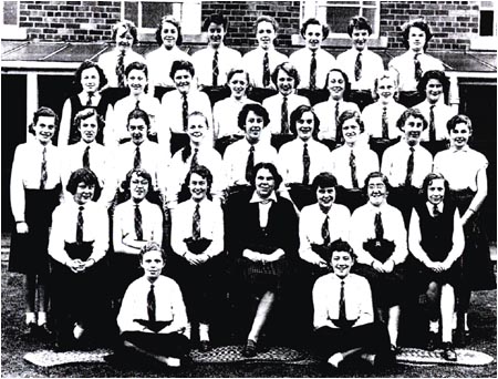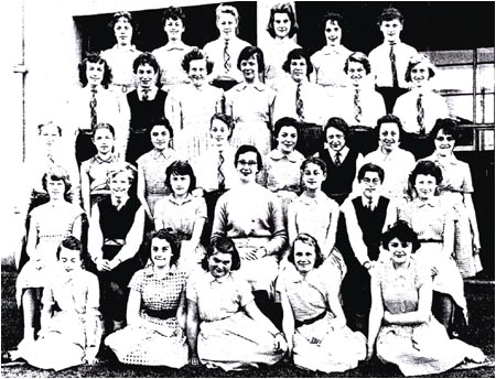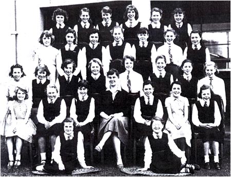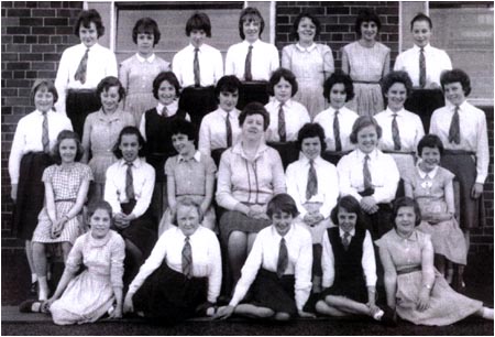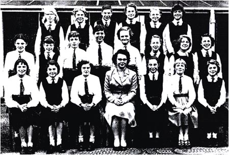 Back Row: S. Snow, unknown, H. Welstead, J. Green, unknown, J. Nicols, P. Ward, M. Allen 3rd Row: G. Johnson, unknown, Felicity ?, J. Barker, S. Jackson, unknown, unknown, unknown, unknown 2nd Row: unknown, Dorothy ?, E. Higginbottom, unknown, G. Fiztpatrick, unknown, Lorraine ?, Viviane ?, A. Rogers Front Row: unknown, M. Taylor, unknown, unknown, Mrs Corrie, S. Street, L. Huckleberry, unknown, A. Roche |