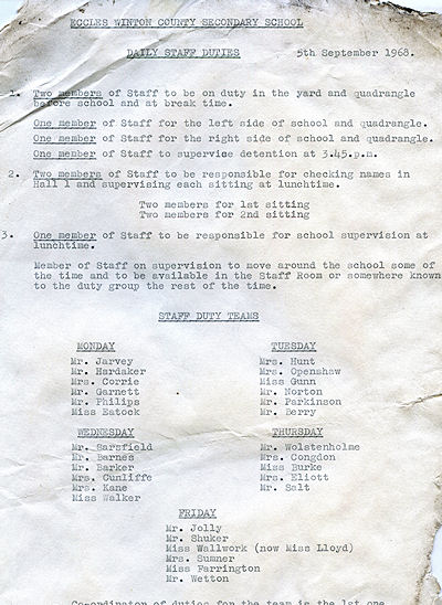 Winton Senior/High. Staff Duties ~ 1968. ~