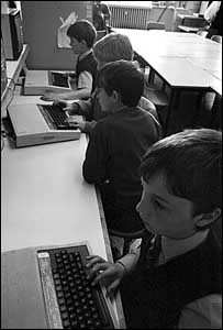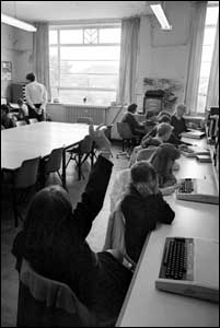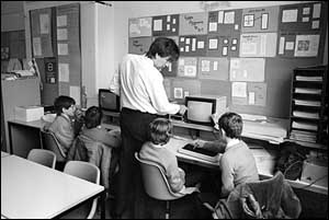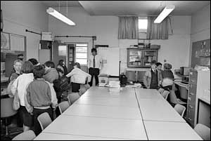 ![]() Here is one student observing the Computer screen with another looking on. The computer math room looks very nicely organized. |
